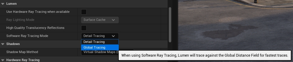 Disable "Use Hardware Ray Tracing when available" or at least set "Software Ray Tracing Mode" to "Global Tracing". This will increase the performance with a low impact on visuals.