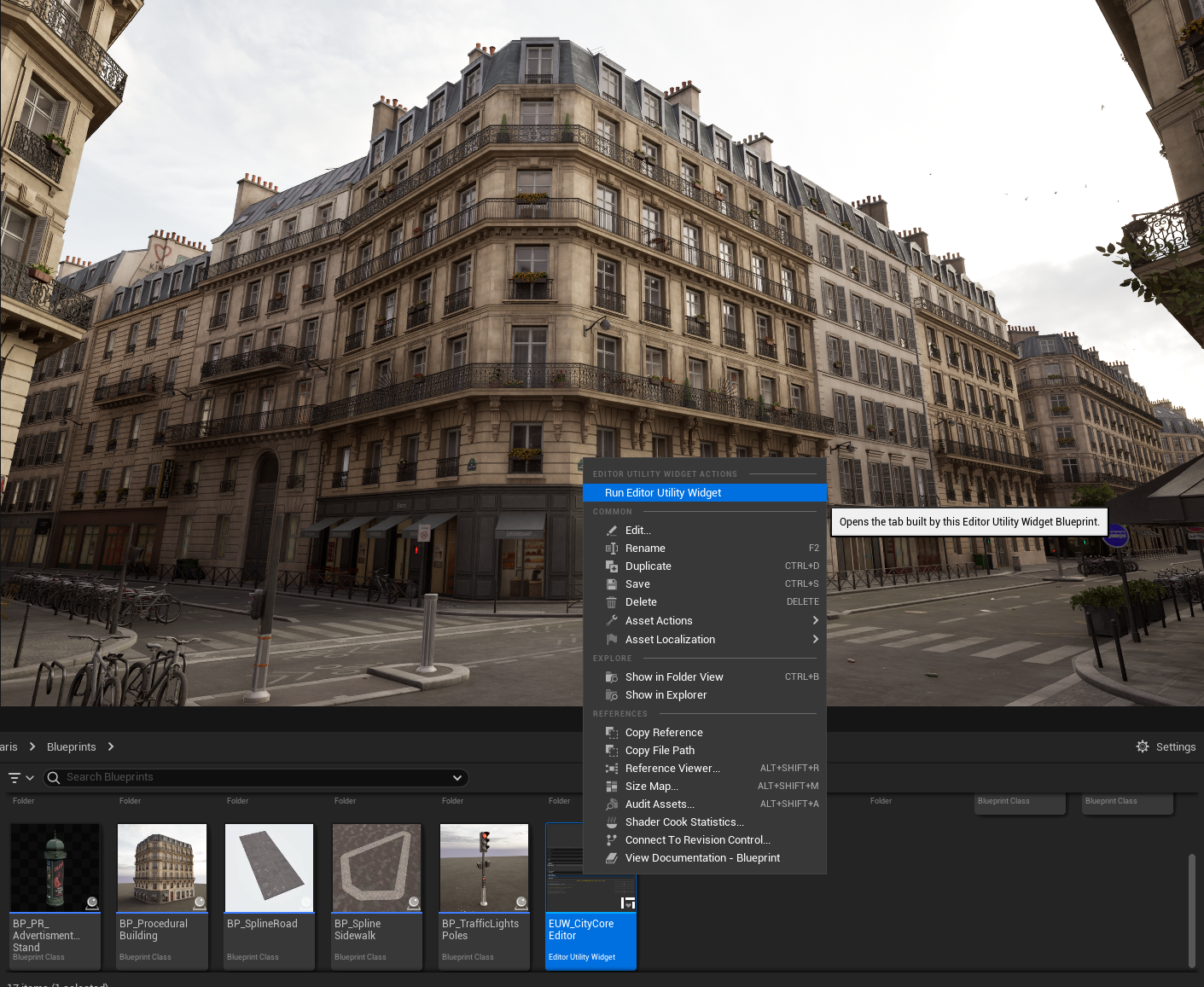 Once the blueprint is in your scene, open the Editor Utility Widget “City Core Editor”.&#x20;